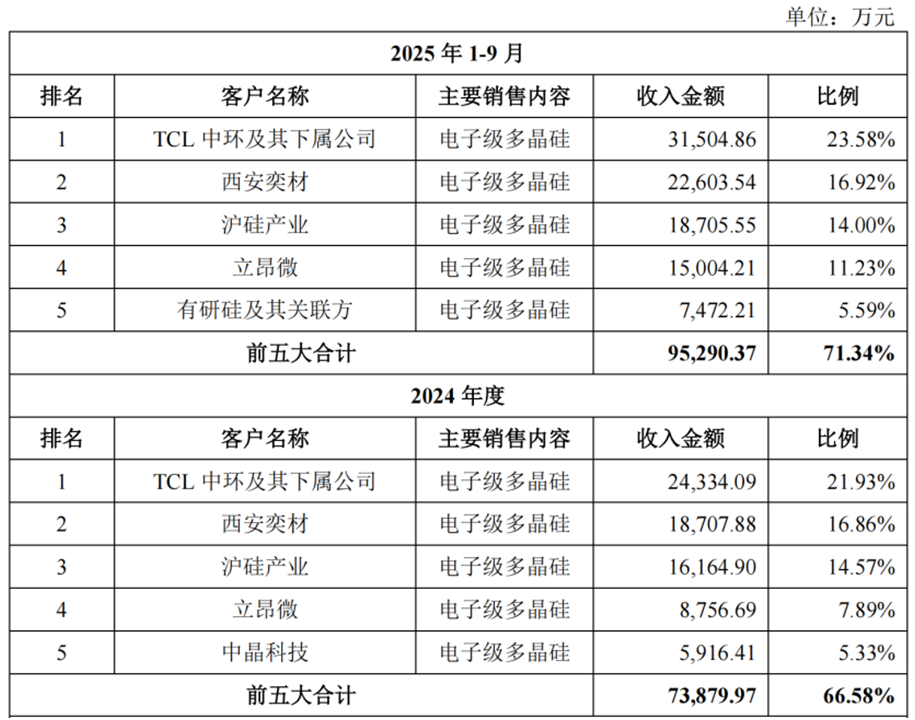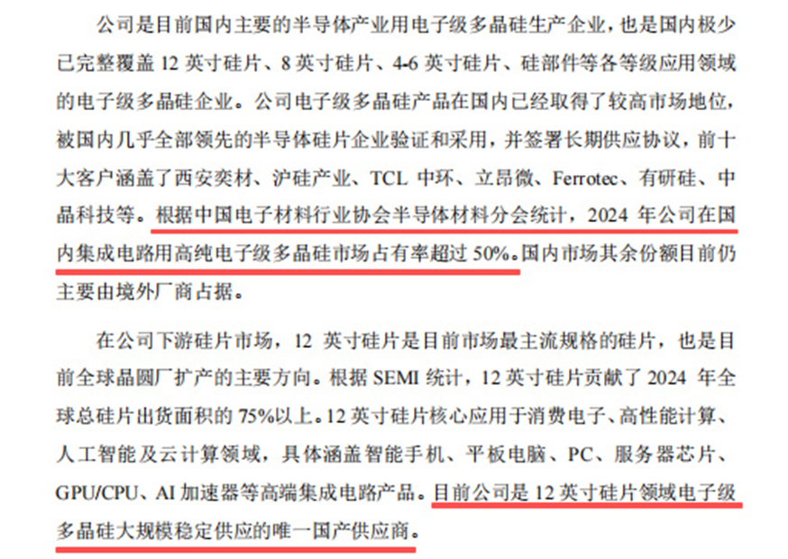 招股书显示,据中国电子材料行业协会半导体材料分会数据,2024年鑫华半导体在国内集成电路用高纯电子级多晶硅市场占有率突破50%,同时也是当前国内唯一能为12英寸硅片领域提供大规模、稳定供货的电子级多晶硅本土企业。