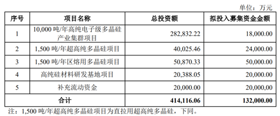 本次IPO,公司拟募集资金13.20亿元,资金投向10,000吨/年高纯电子级多晶硅产业集群项目、1,500吨/年超高纯多晶硅项目、1,500吨/年区熔用多晶硅项目、高纯硅材料研发基地项目及补充流动资金。上述项目总投资41.41亿元,拟分别使用募集资金1.80亿元、2.40亿元、5.00亿元、2.00亿元、2.00亿元。