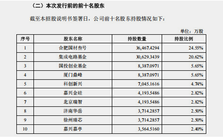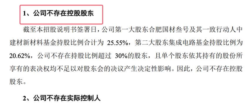 截至招股书签署日,其第一大股东为合肥国材叁号企业管理合伙企业(有限合伙),持股24.55%;国家大基金持股20.62%,位列第二大股东。无单一主体能实际控制公司,招股书提示,这可能影响决策效率、引发控制权变动风险。