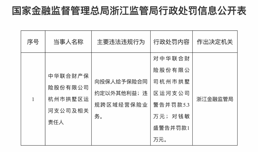 中华联合财产保险股份有限公司杭州市拱墅区运河支公司因向投保人给予保险合同约定以外其他利益、违规跨区域经营保险业务,被国家金融监督管理总局浙江监管局警告并罚款5.3万元;相关责任人钱敏盛被警告并罚款1万元。