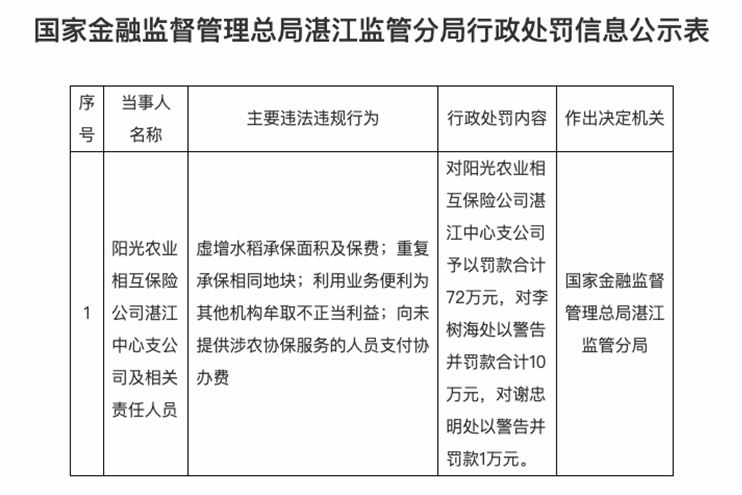 阳光农业相互保险公司湛江中心支公司因存在多项违法违规行为被国家金融监督管理总局湛江监管分局罚款合计72万元。具体违规行为包括:虚增水稻承保面积及保费;重复承保相同地块;利用业务便利为其他机构牟取不正当利益;向未提供涉农协保服务的人员支付协办费。相关责任人员李树海被警告并罚款合计10万元,谢忠明被警告并罚款1万元。