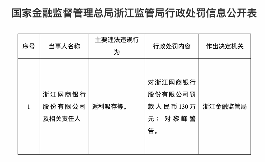 根据国家金融监督管理总局浙江监管局披露的行政处罚信息,浙江网商银行股份有限公司因“返利吸存”等行为被罚款130万元,对相关责任人黎峰警告。
