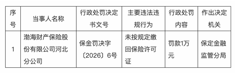 同日,渤海财产保险股份有限公司河北分公司因未按规定缴回保险许可证,被国家金融监督管理总局保定监管分局罚款1万元。