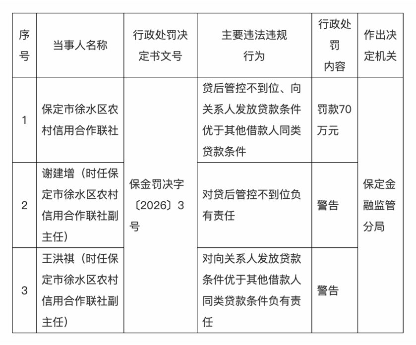 同日,国家金融监督管理总局披露,保定市徐水区农村信用合作联社因贷后管控不到位、向关系人发放贷款条件优于其他借款人同类贷款条件,被罚款70万元;谢建增(时任保定市徐水区农村信用合作联社副主任)对贷后管控不到位负有责任,王洪祺(时任保定市徐水区农村信用合作联社副主任)对向关系人发放贷款条件优于其他借款人同类贷款条件负有责任,均被警告。