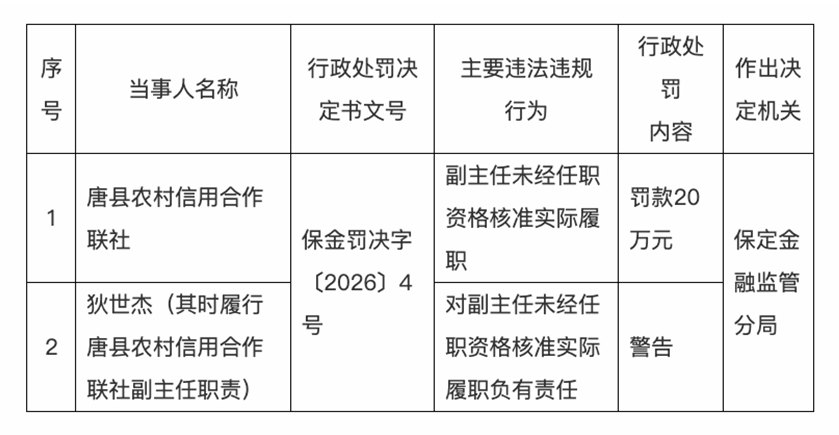 唐县农村信用合作联社被罚款20万元,副主任狄世杰未经任职资格核准实际履职,被警告。