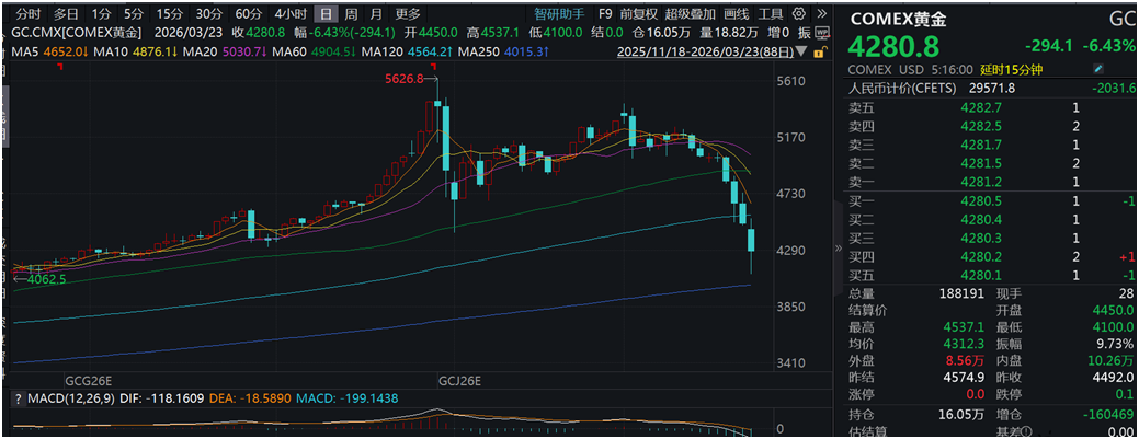 3月23日交易时段,金价再度大幅跳水,纽约商品交易所4月黄金期货价格盘中一度跌至每盎司4100美元;伦敦现货金价今天盘中接连失守4500、4400、4300、4200美元/盎司关口。