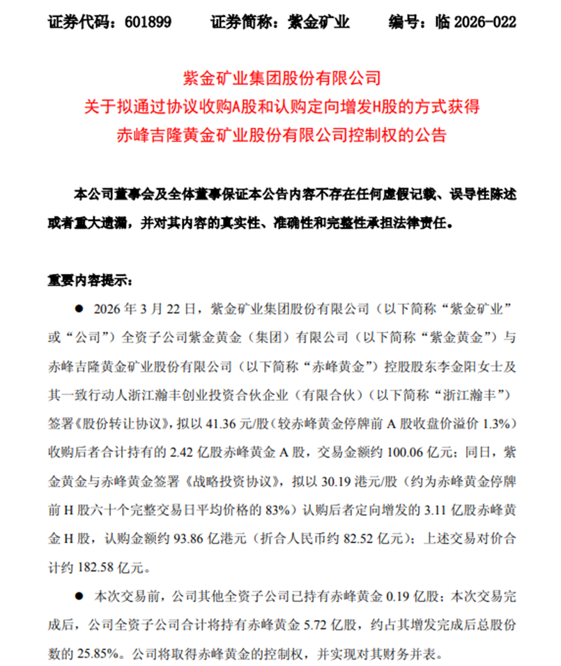 2026年3月23日,A股有色矿业板块迎来重磅消息——紫金矿业集团股份有限公司(以下简称“紫金矿业”,601899.SH)拟通过“股权转让+定向增发”组合拳,以合计182.58亿元的对价,正式取得赤峰吉隆黄金矿业股份有限公司(以下简称“赤峰黄金”,600988.SH)控制权,后者实控人李金阳及其一致行动人彻底退出持股。