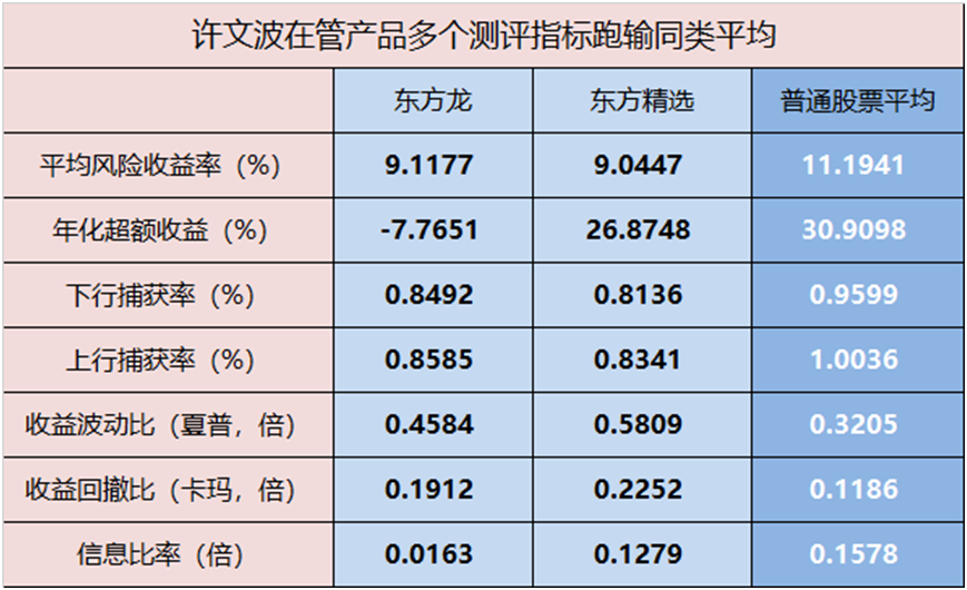 原来,据Wind数据统计,截至2025年年底,在主流的基金测评指标中,许文波跳槽到东方基金之后的7年里,其在管产品东方龙和东方精选有多个主要指标上表现不佳,尤其是平均风险收益率比普通股票型基金平均少了2成以上,年化超额收益、收益波动比(夏普比率)、收益回撤比(卡玛比率)、信息比率等重要指标都大幅跑输,而上行捕获率(市场上行阶段的收益抓取能力)表现不错但被下行捕获率(市场下行阶段的收益抓取能力)偏低抵消。