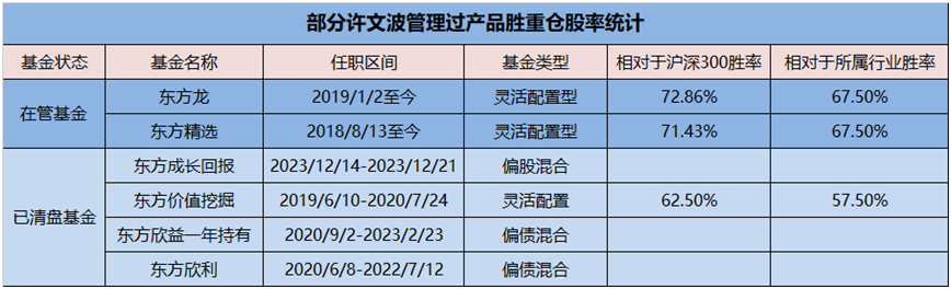 结合2019至2021年初是震荡上行行情,2021年初-2024下半年是震荡下行行情,2024下半年至今是结构性行情,分阶段分析,许文波独立管理的东方龙和东方精选,有如下几个特征: