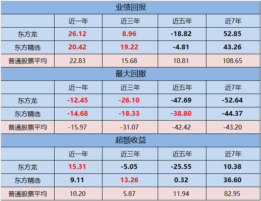 4、产品表现分化显著:东方精选:长期超额稳定,近三年、近七年超额均为正,回撤控制较好;东方龙:波动大、回撤深、超额不稳定,近五年超额为-25.55%,反映出基金经理在不同产品上的管理效果并不一致。