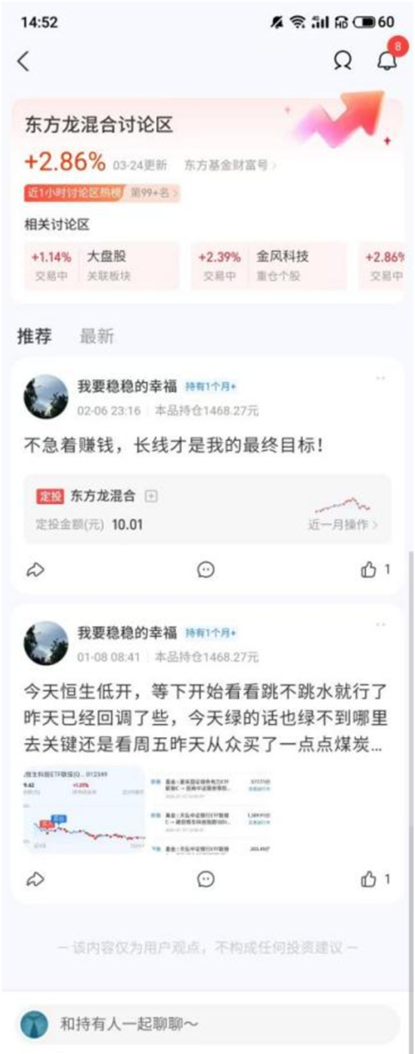 通常情况下,投资者对基金产品或基金经理有疑问,往往会优先选择在网上发声。但今年以来,东方精选混合的天天基金网基金吧内,基民发帖数仅11条,蚂蚁财富讨论区5条;东方龙的天天基金网基金吧内共4条,蚂蚁财富(支付宝基金)讨论区仅1条有效发言,2026年以前的内容已全部删除清空。