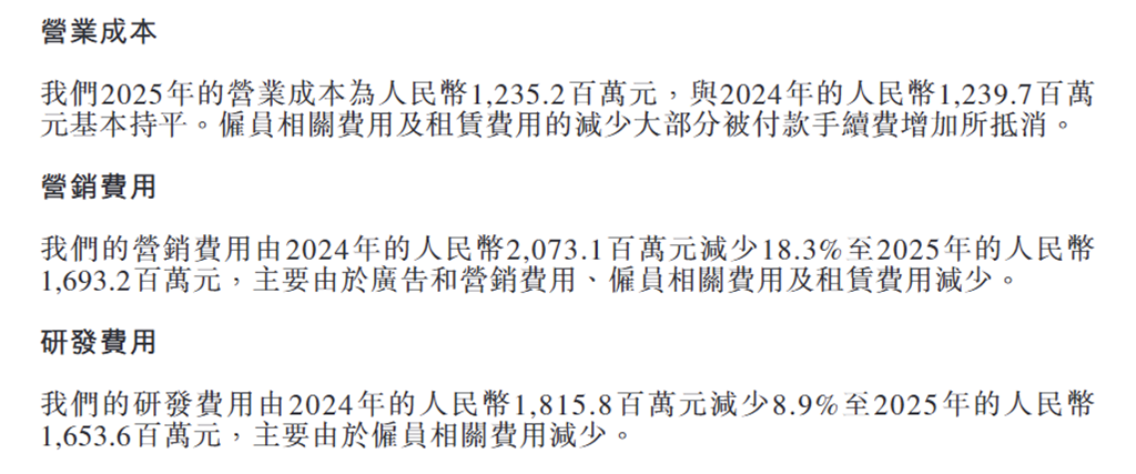 利润暴增的核心驱动力是极致的成本管控:全年销售及营销费用16.93亿元,同比下降18.3%;研发费用16.54亿元,同比下降8.9%;营业成本12.35亿元,基本与上年持平,总运营成本及费用同比下降7.1%。