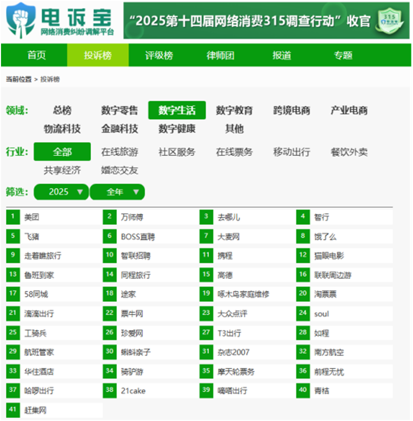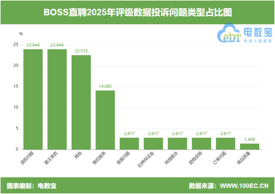 与亮眼财报形成鲜明对比的,是BOSS直聘持续恶化的用户口碑与不断升级的合规压力。网经社电子商务研究中心2025年消费投诉数据显示,BOSS直聘位列数字生活领域投诉榜第6位,全年获得20次消费评级,其中9次“谨慎下单”、6次“不建议下单”,负面评级占比高达75%。