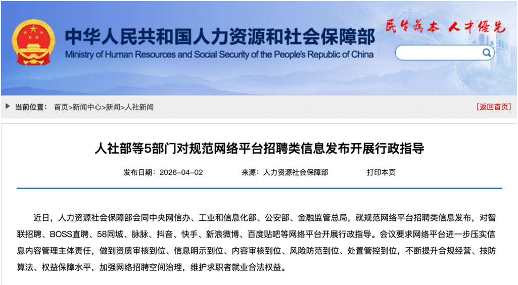 更为严峻的是,2026年4月2日,人社部、中央网信办、工信部、公安部、金融监管总局五部门联合开展行政指导,将BOSS直聘纳入重点整治对象,明确提出“五个到位”硬要求:资质审核到位、信息明示到位、内容审核到位、风险防范到位、处置管控到位,直指平台长期存在的审核不严、虚假招聘、违规收费等顽疾。此次监管并非短期约谈,而是行业规范化的标志性节点,或许在某种程度上也意味着BOSS直聘粗放式增长时代正式终结。
