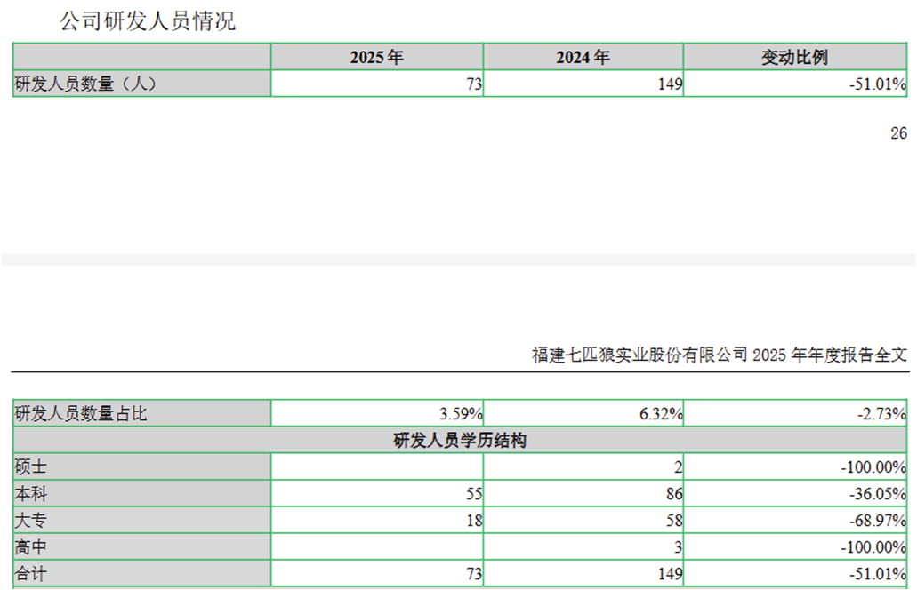 研发投入的“逆向收缩”成为战略失焦的典型体现。2025年公司研发费用仅3241万元,同比大幅下降44.95%,研发费用率骤降至1.08%;研发人员从149人缩减至73人,降幅达51%,硕士及以上学历研发人员全部流失,自主研发能力实质弱化。即便公司将研发活动前置至供应链合作伙伴,声称“提升研发效率”,但供应链研发成果不具备独占性,导致公司在面料科技、功能设计等核心领域的技术优势难以持续。在服装行业向功能性、科技化升级的背景下,研发投入的腰斩,本质是对产品创新的忽视。