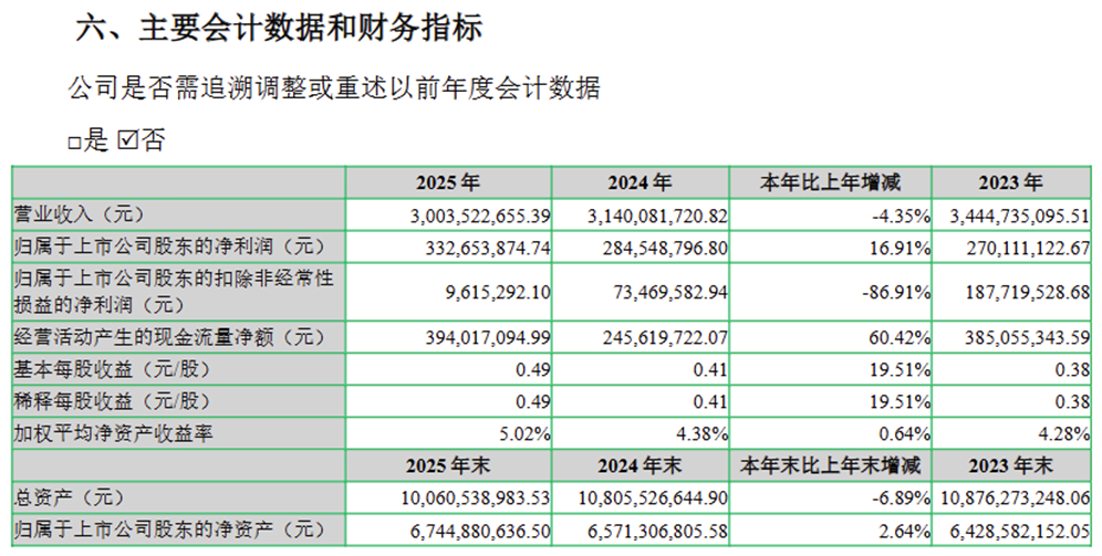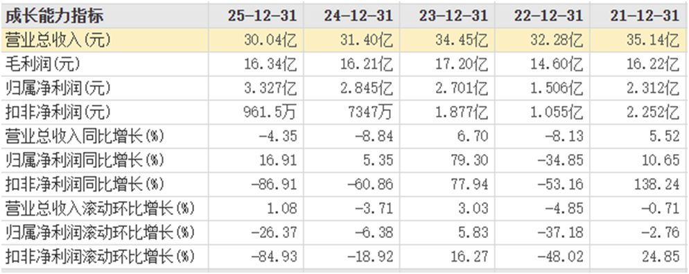 财报数据显示,公司2025年归母净利润3.33亿元,同比增长16.91%,但非经常性损益高达3.23亿元,占归母净利润比例达97%,较2024年同比增长53.04%。剔除非经常性损益后,扣非归母净利润仅961万元,同比下滑86.91%,这一数据直接反映出公司服装主业的实际盈利水平已近乎枯竭。
