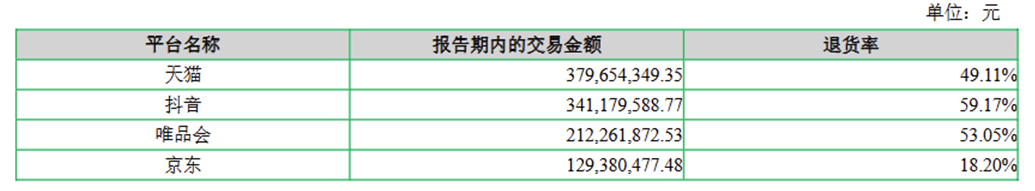 除此之外,线上渠道则陷入“高退货率、低盈利”困境,天猫、抖音渠道退货率分别达49%、59%,实际净销售大幅低于交易流水,2025年线上销售收入同比下滑7.36%至10.63亿元。