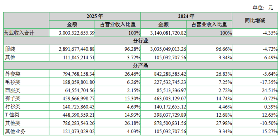 与之形成鲜明对比的是,公司核心服装业务持续承压,2025年服装业务总营收28.92亿元,同比下滑4.72%,主打品类外套类营收7.95亿元,同比下滑5.64%,仅衬衫、T恤两类小众产品实现营收正增长,核心品类竞争力持续弱化。
