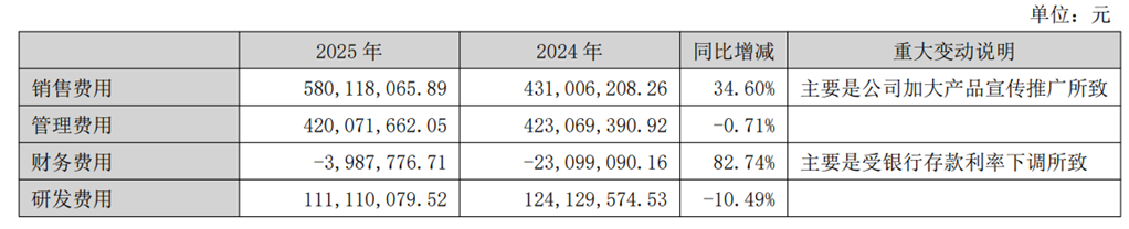 更令人担忧的是公司的费用失控。财报披露,2025年公司销售费用高达5.80亿元,在营收大幅萎缩的背景下逆势激增34.60%,占营业收入的比例高达25.03%。这种在逆境中疯狂砸钱做市场推广的“止血”行为,虽然短期内维持了市场份额,但远超研发投入的销售费用率,无疑进一步吞噬了宝贵的利润,让公司的核心盈利模式面临严峻挑战。